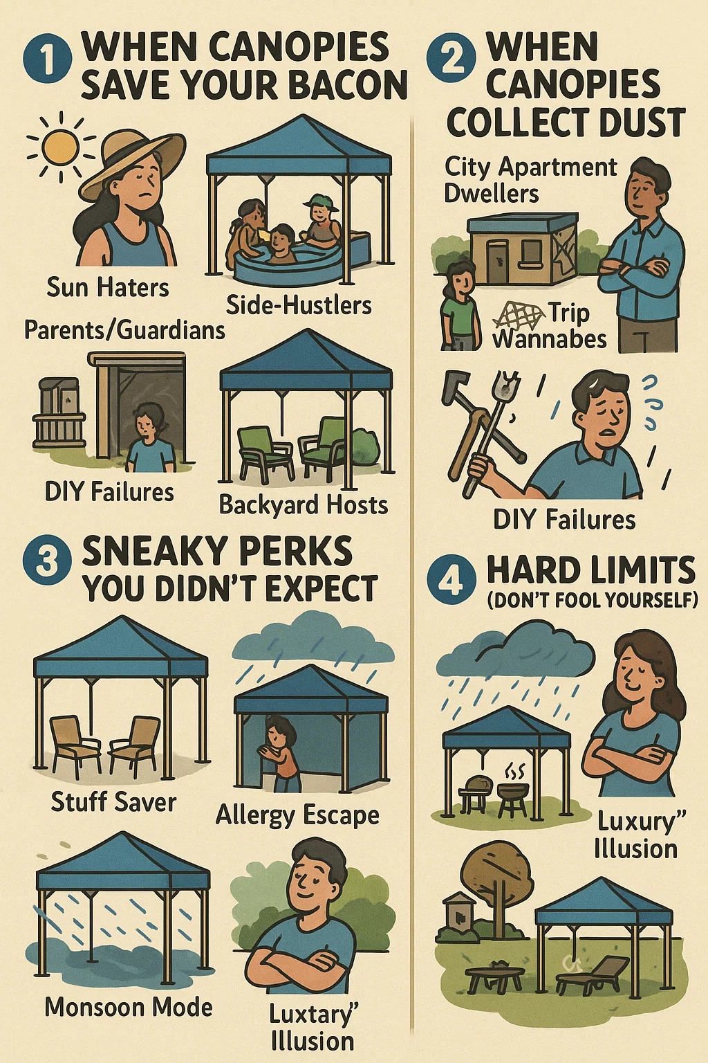 Anfitriones del patio trasero: ¿Aguacero repentino durante una barbacoa? Todos se acurrucan bajo el dosel mientras la parrilla chisporrotea.