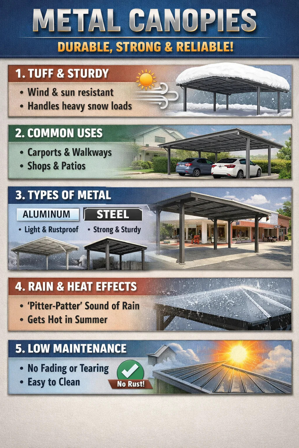 Unlike fabric awnings that are folded away after use, metal canopies are designed for stability.