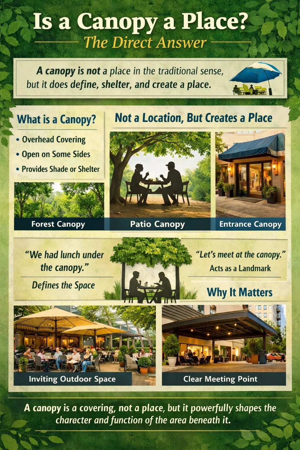 Es por eso que la gente usa la palabra como si describiera un lugar incluso cuando técnicamente describe una estructura. El dosel se gana ese tratamiento haciendo lo que hacen los lugares: cambia cómo se sienten las personas, cuánto tiempo permanecen y qué recuerdan sobre la experiencia de estar allí.