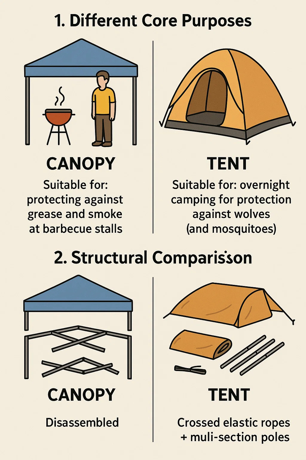 Marquesinas y las tiendas de campaña son cosas completamente diferentes: una es como el dosel de un puesto al borde de la carretera, la otra es como un dormitorio portátil.