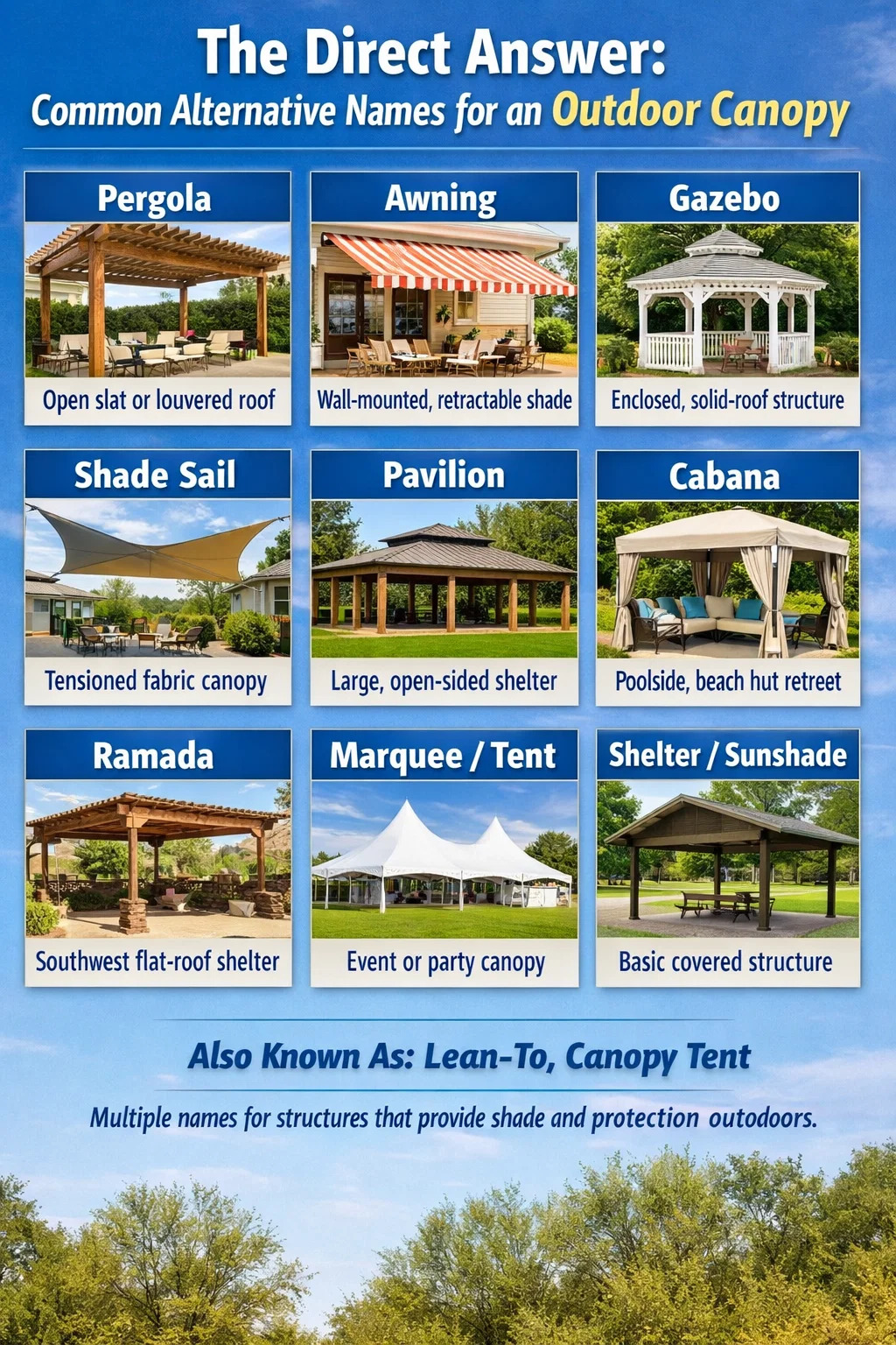 Un dosel para exterioes recibe muchos nombres según su estructura, material y uso previsto. Las alternativas más utilizadas incluyen pérgola, toldo, mirador, vela de sombra, pabellón, cabaña, ramada y refugio . Cada término describe una estructura ligeramente diferente, pero todos tienen el mismo propósito principal: proporcionar cobertura superior y sombra en un entorno al aire libre. En las conversaciones cotidianas y en la industria de mejoras para el hogar, estas palabras suelen usarse indistintamente, aunque los profesionales hacen distinciones claras entre ellas.