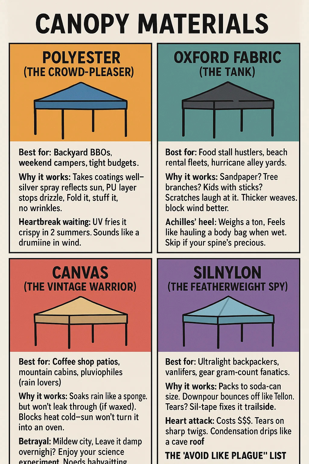 Aguacero de todo el día | Silnylon o lienzo encerado | Fugas de poliéster en costuras eventualmente |