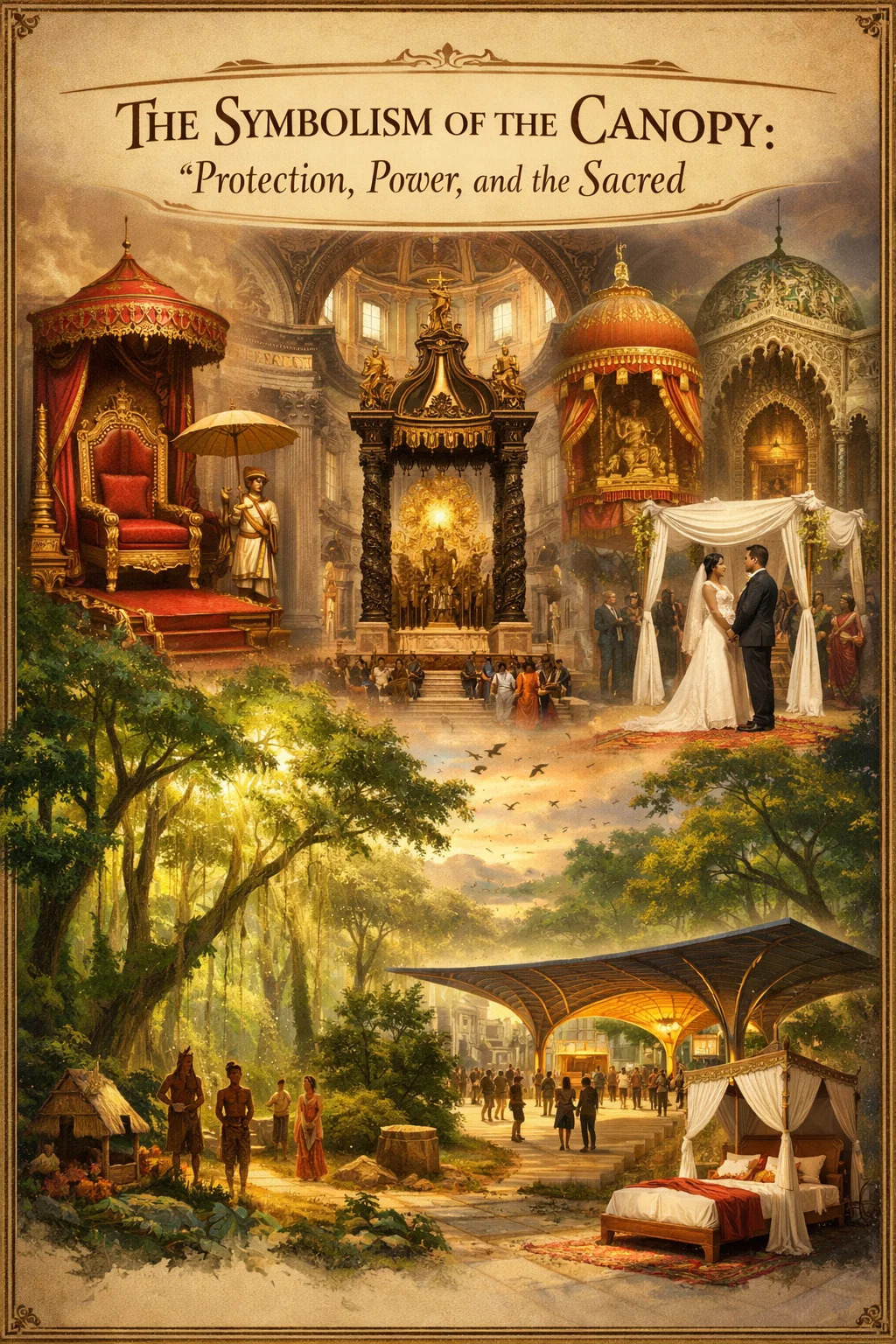 un dosel simboliza protección, autoidad divina, estatus elevado y el límite entre lo terrenal y lo sagrado. . A lo largo de miles de años y docenas de culturas, el dosel (ya sea un baldaquino ceremonial sobre un trono, una jupá nupcial, un dosel de árbol forestal o un refugio arquitectónico elevado) conlleva un significado estratificado que va mucho más allá de su función física de proporcionar sombra o cobertura.