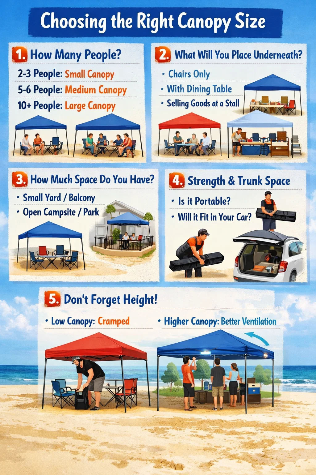 Cuando se trata de elegir el tamaño de una marquesina, no existe un único "mejor" tamaño, sólo el más "adecuado". Elegir uno que es demasiado grande ocupa demasiado espacio y es pesado, mientras que elegir uno que es demasiado pequeño significa que todos están hacinados y expuestos al sol; ambas cosas son bastante incómodas.